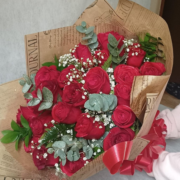 Lindo buquê, confeccionado com 24 rosas vermelhas, eucalipto, mosquitinho e folhagens em uma linda embalagem em papel craft, tornando este buquê um presente perfeito para qualquer ocasião, seja ela romance, aniversário, casamento, bodas, formatura, amizade.