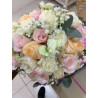 Buquê de noiva composto por rosas, begonias, lisianthus, mosquitinho, eucalipto, com fino acabamento em cetim e pedrarias