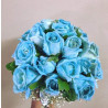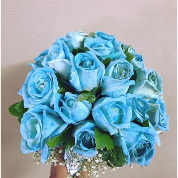 Buquê de rosas brancas, com coloração artificial azul claro, mosquitinho e acabamento com cetim e pedrarias