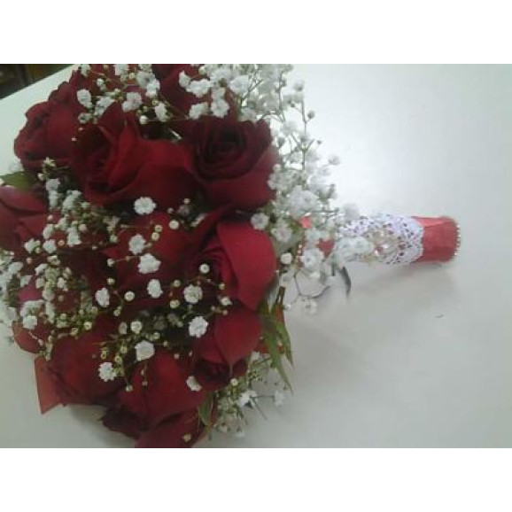 Lindo buquê, composto por rosas, mosquitinho, fino acabamento em cetim e pedrarias.