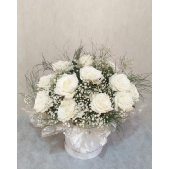 Lindo arranjo composto por 12 rosas brancas, mosquitinho ou aster, folhagens em uma caixa .