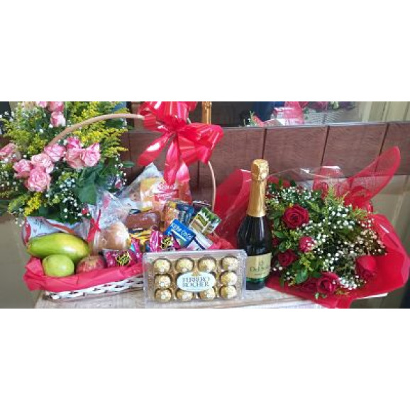 Esta linda cesta além de proporcionar um delicioso café da manhã, também irá surpreender aquela pessoa especial com um lindo buquê de 12 rosas e uma garrafa de champagne (del sole ou similar) 01 caixa de chocolates Ferrero Roche, para a comemoração ficar completa e com estilo.( A cesta matinal é composta por 1 Biscoito Temperado 01 Achocolatado 200 ml 01 Biscoito Integral 01 Suco 200 ml 01 mini bolo 02 Biscoito Maisena 02 Torrada Bauduco 02 Biscoito Leite/chocolate 01 Mini wafer 01 Biscoito Banana/canela 01 Wafer Lanchinho 01 Biscoito Leite 02 sache geleia 10 gr 01 Biscoito Coco 01 sache margarina 10 gr 01 sache creme 10 gr 01 sache chá 01 sache café 01 Biscoito salgado cracker 02 sache açúcar 02 sache adoçante 02 Frutas 01 iorgute 04 mini pães).