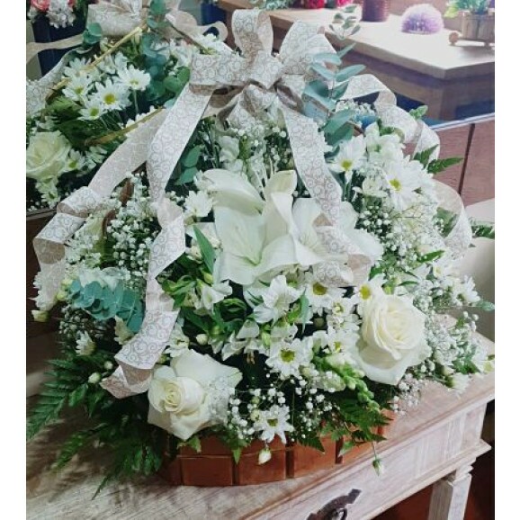 Linda cesta composta por mix de flores brancas, seleciondas conforme a época do ano, perfeitas para presentear, prestar condolências, enfeitar algum ambiente.